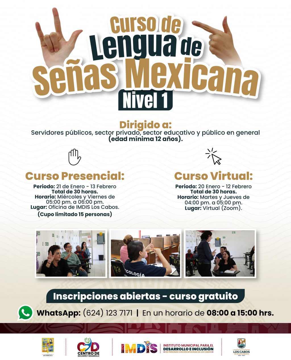 Los Cabos, Baja California Sur | 12 de enero del 2026.– Con el propósito de fortalecer una comunidad más incluyente, empática y sin barreras de comunicación, el Instituto Municipal para el Desarrollo e Inclusión de Personas con Discapacidad (IMDIS) informa la apertura de nuevos cursos gratuitos de Lengua de Señas Mexicana (LSM), en los niveles 1 y 2, dirigidos a la ciudadanía interesada en aprender esta herramienta de comunicación para su vida cotidiana, académica o laboral.