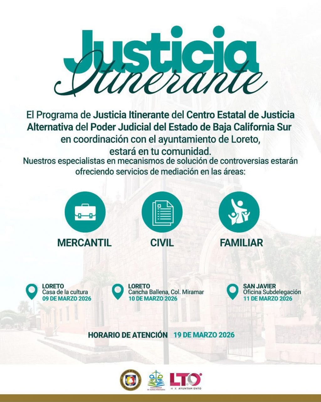 LORETO, B.C.S.– 06 de marzo de 2026.– Como parte de las políticas públicas orientadas a fortalecer el acceso a la justicia y promover la resolución pacífica de conflictos, el XI Ayuntamiento de Loreto, encabezado por la alcaldesa Paz Ochoa Amador, trabaja de manera coordinada con el Centro Estatal de Justicia Alternativa para acercar al municipio el Programa de Justicia Itinerante.