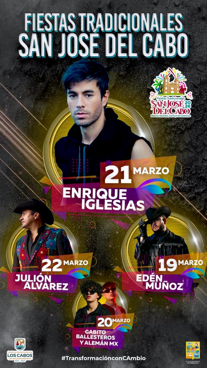 Los Cabos, Baja California Sur.– La espera terminó, este viernes 27 de febrero el alcalde de Los Cabos, Christian Agúndez Gómez, dio a conocer la cartelera oficial de artistas que se presentarán durante las Fiestas Tradicionales San José Del Cabo 2026. A través de una transmisión en vivo realizada en su página oficial de Facebook, el presidente municipal informó que el encargado de abrir el escenario principal de esta celebración será Edén Muñoz, el jueves 19 de Marzo.
