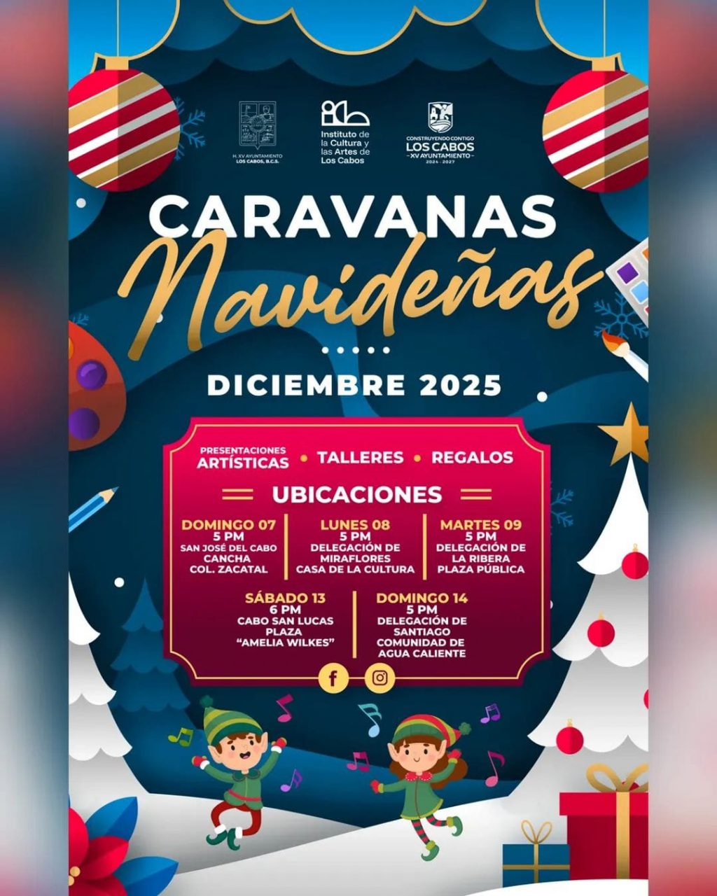 Los Cabos, Baja California Sur | 6 de diciembre del 2025.- El XV Ayuntamiento de Los Cabos, a través del Instituto de la Cultura y las Artes (ICA) anunció que como parte de los festejos decembrinos y con el propósito de fortalecer la convivencia familiar, se llevarán a cabo las Caravanas Navideñas 2025 en las cuatro delegaciones y la cabecera municipal.