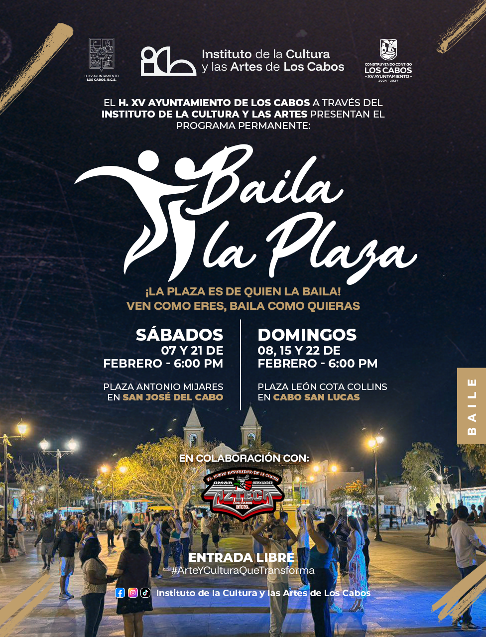 Los Cabos, Baja California Sur | 17 de febrero del 2026.– El XV Ayuntamiento de Los Cabos, a través del Instituto de la Cultura y las Artes (ICA), continúa con gran respuesta ciudadana el programa permanente “Baila la Plaza”, una iniciativa orientada a fomentar la sana convivencia, el uso positivo de los espacios públicos y el disfrute del arte mediante el baile.