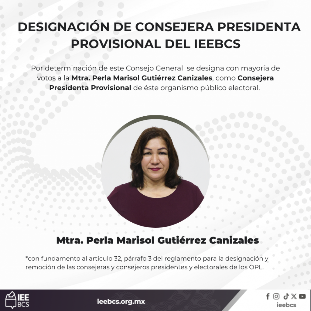 En Sesión Extraordinaria Urgente, el Consejo General del Instituto Estatal Electoral de Baja California Sur (IEEBCS) aprobó la designación de la Mtra. Perla Marisol Gutiérrez Canizales como presidenta provisional del organismo, hasta que el Consejo General del Instituto Nacional Electoral sesione para la designación de una presidencia provisional a propuesta de la Comisión de Vinculación con los Organismos Públicos Locales en tanto se realiza el nombramiento definitivo en términos del resolutivocuarto de la resolución INE/CG105/2026.