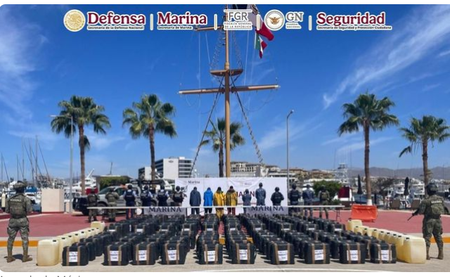 El Gabinete de Seguridad informa que, resultado de los patrullajes constantes en la mar, en una acción encabezada por elementos de la Secretaría de Marina (Semar), a través de la Armada de México en funciones de guardia costera, en coordinación con la Secretaría de la Defensa Nacional (Defensa), Fiscalía General de la República (FGR), Guardia Nacional (GN) y Secretaría de Seguridad y Protección Ciudadana (SSPC), en costas del Pacífico Mexicano, se aseguraron alrededor de 4,500 kilogramos de cocaína, 1,700 litros de combustible y fueron detenidas cuatro personas.