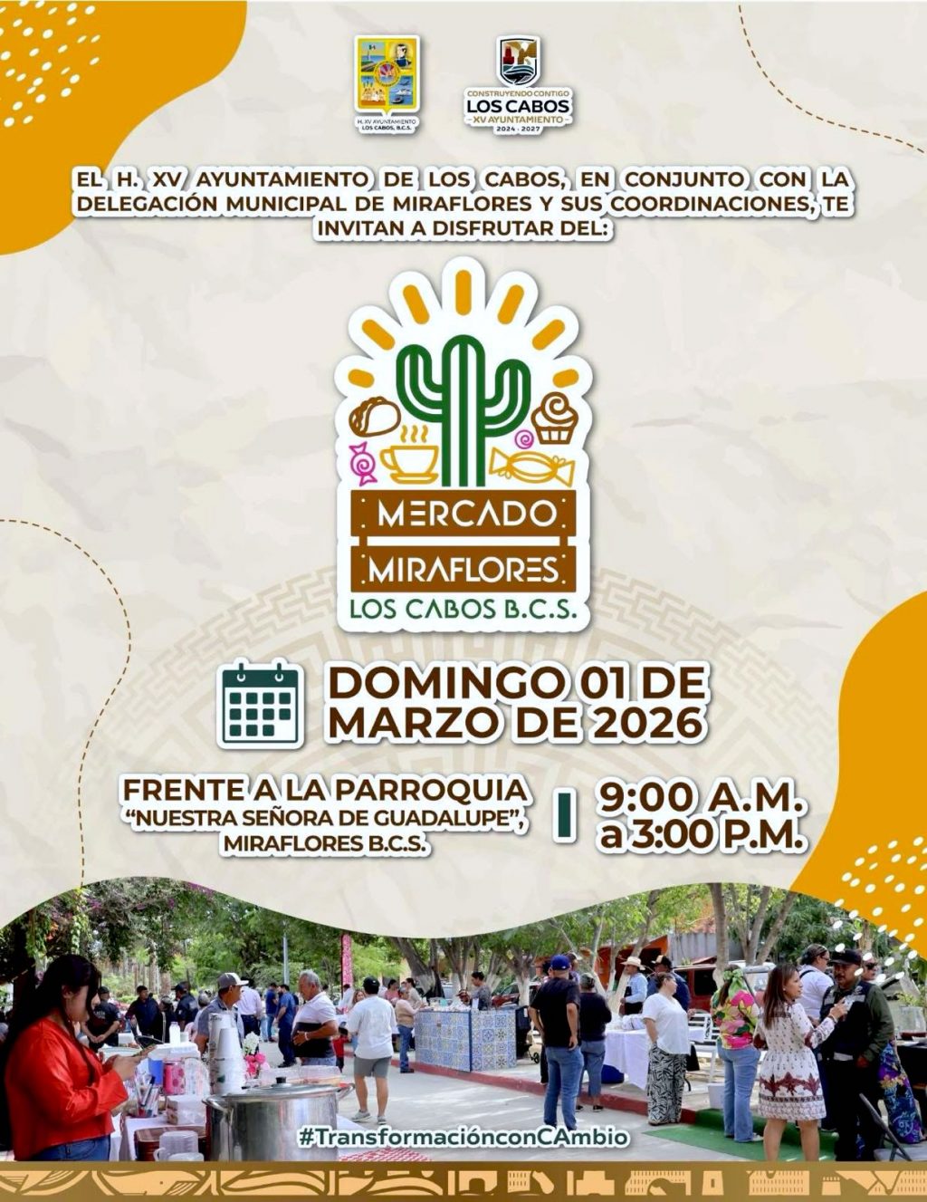 El XV Ayuntamiento de Los Cabos extiende una cordial invitación a las familias y visitantes para asistir al “Mercado Miraflores” el próximo domingo 01 de marzo, en un horario de 09:00 a 15:00 horas, frente a la parroquia Nuestra Señora de Guadalupe.