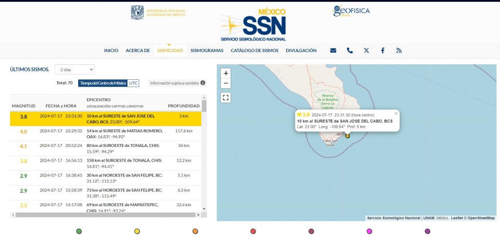 Los Cabos, B.C.S., 18 de julio de 2024.- El personal de la Dirección Municipal de Protección Civil informa que el día miércoles 17 de julio de 2024, alrededor de las 11:00 de la noche se registró un sismo de magnitud 3.8 en la escala de Richter, a 10 km al sureste de San José del Cabo, B.C.S., con una profundidad de 5 km.