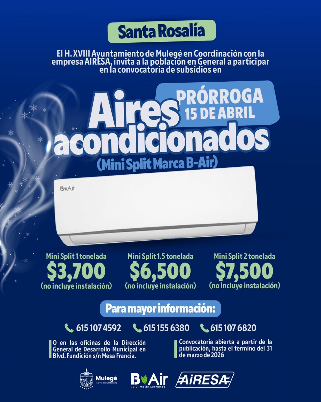 El H. XVIII Ayuntamiento de Mulegé, en coordinación con la empresa Airesa, informa a la ciudadanía que se extiende la convocatoria del programa de subsidio para la adquisición de aires acondicionados, con el objetivo de brindar más tiempo y oportunidad a las familias muleginas interesadas en acceder a este beneficio.