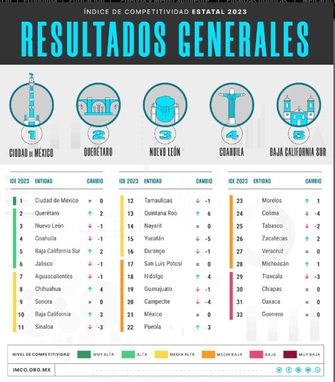 De acuerdo con una medición realizada por el Instituto Mexicano para la Competitividad (IMCO), Baja California Sur se encuentra dentro de los resultados generales del Índice de Competitividad Estatal 2023 (ICE), en el quinto puesto a nivel nacional.
