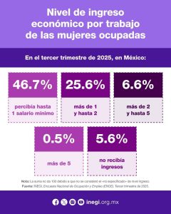A nivel nacional, el análisis del ingreso de las mujeres ocupadas revela que 46.7% percibe hasta un salario mínimo, mientras que 25.6% gana entre uno y dos salarios mínimos. Además, 6.6% obtiene entre dos y cinco salarios mínimos, 0.5% percibe más de cinco salarios mínimos y 5.6% reportó no recibir ingresos.