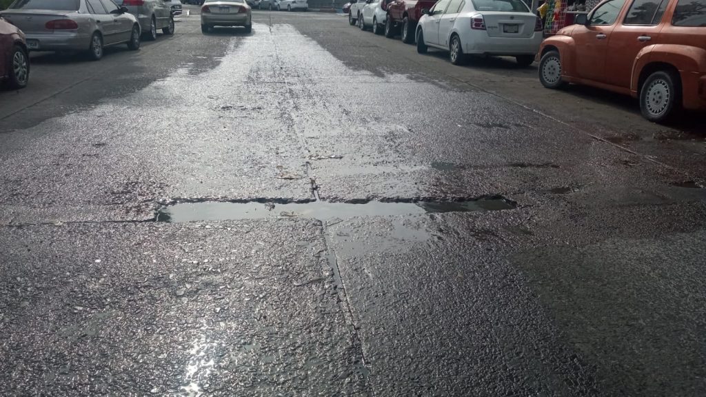 - Se derrama un drenaje de un comercio desde hace 5 años y este ha provocado el derrama de aguas negras a la calle que ya abrió una zanja de 30 cm de profundidad y dos metros de ancho.