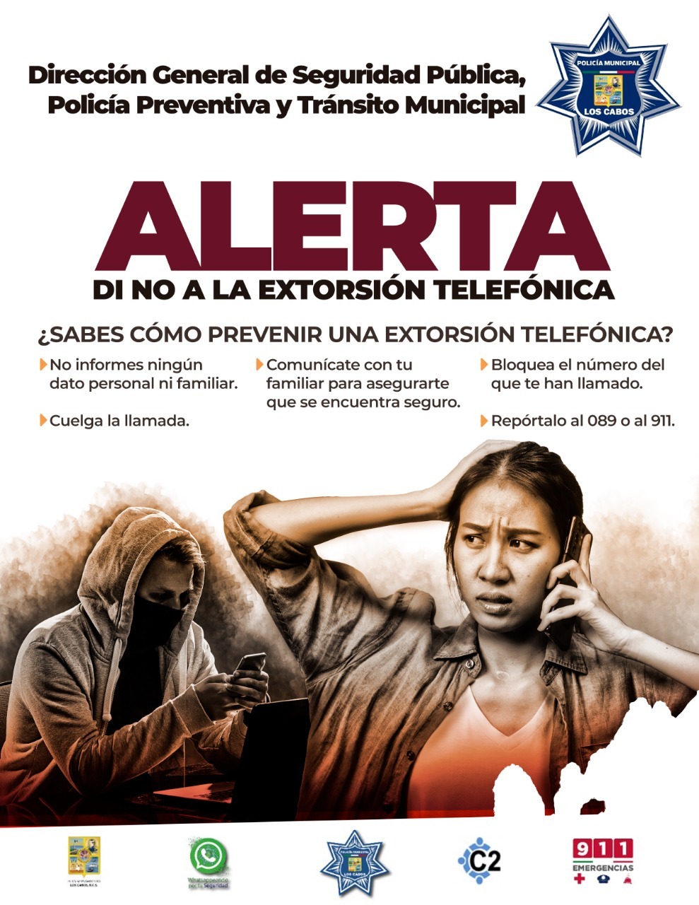 Con el objetivo de proteger a la ciudadanía de las llamadas de extorsión telefónica, el Ayuntamiento de Los Cabos exhorta a las y los residentes del municipio a estar atentos y tomar las acciones sugeridas por la Dirección General de Seguridad Pública, Policía Preventiva y Tránsito Municipal.