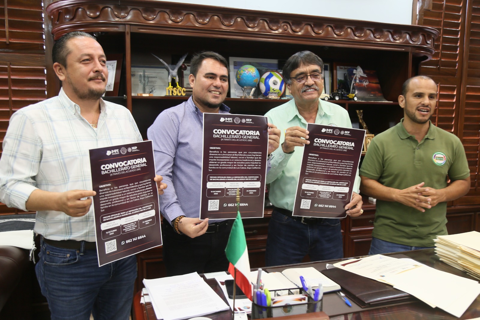 Como parte de la agenda de este miércoles 11 de octubre, el alcalde de Los Cabos Oscar Leggs Castro, acompañado del director municipal de Educación, Jorge Servín Meza y el I regidor del XIV Ayuntamiento, Rogelio Tornero Carrillo, se reunió con el representante del Instituto Mexicano de Profesionalización Educativa (IMPE), Sergio López, para presentar la convocatoria para la acreditación del bachillerato general.