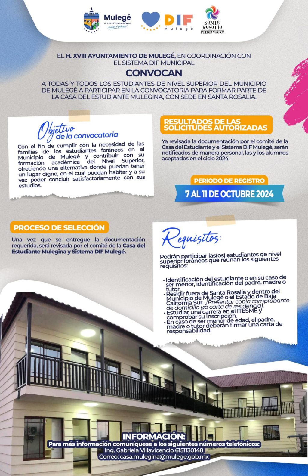 Aquellas familias que deseen mayores informes pueden comunicarse con la directora de la Casa del Estudiante, Gabriela Villavicencio al teléfono 6151130148 o bien, al correo electrónico casa.mulegina@mulege.gob.mx , donde se les brindará asesoría en el proceso de inscripción.