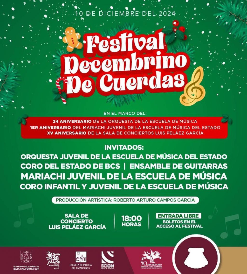 Este próximo 10 de diciembre en la Sala de Conciertos Luis Peláez García se llevará a cabo el Festival Decembrino de Cuerdas, un evento que reafirma el compromiso del Instituto Sudcaliforniano de Cultura (ISC) con el desarrollo y la difusión de la música en la región, informó el director general de la dependencia, Víctor Hugo Caballero Gutiérrez.