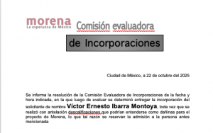 Este miércoles, la Comisión Evaluadora de Incorporaciones de Morena, determinó rechazar la afiliación del Dr Ernesto Ibarra Montoya, quien solicitó su adhesión en este 2025, luego de que el pasado proceso del 2024, fue candidato del PAN-PRI-PRD a la alcaldía de Los Cabos, luego de que el pasado 17 de septiembre del 2025 el Consejo Nacional de Morena instaló esta comisión que evaluará incorporaciones al instituto político, cuando estas vienen de candidaturas antagónicas a la 4 T.