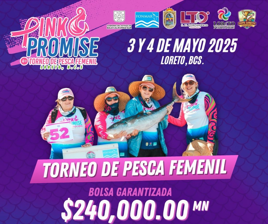 Loreto, B.C.S. 3 de mayo, 2025.- Con una bolsa garantizada de 240 mil pesos y ante el incremento constante de equipos participantes al torneo de pesca deportiva femenil más grande del estado, la presidenta municipal del XI ayuntamiento de Loreto Paz del Alma Ochoa Amador, confirmó que, con la apertura de la mesa de registros, está tarde arranca la cuarta edición del torneo “PINK PROMISE” en Loreto.