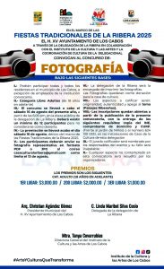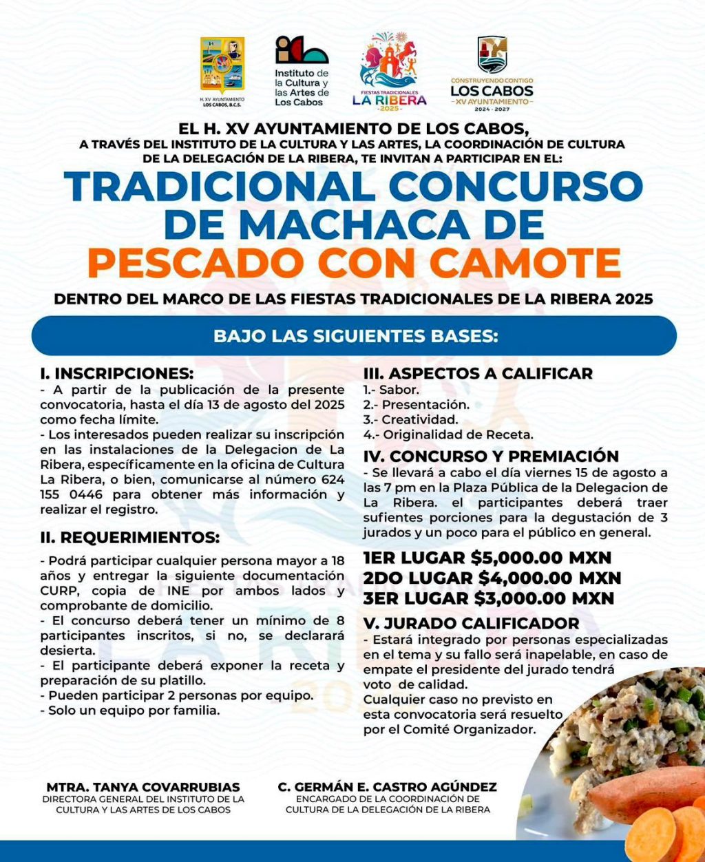 Los Cabos, Baja California Sur | 11 de agosto del 2025.- El XV Ayuntamiento de Los Cabos, invita a la comunidad en general a participar en dos eventos que destacan la identidad y el talento local, se trata del tradicional Concurso de Machaca de Pescado con Camote y el Concurso de Fotografía “Paisajes Ribereños”, organizados en el marco de las Fiestas Tradicionales de La Ribera 2025, a través de la Delegación Municipal de La Ribera y el Instituto de la Cultura y las Artes (ICA).