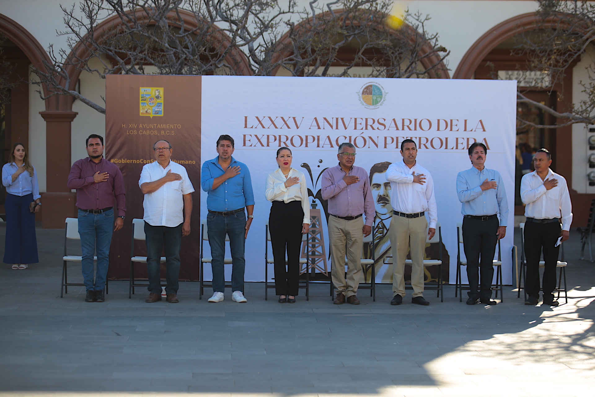 En representación del alcalde de Los Cabos Oscar Leggs Castro, este jueves 16 de marzo, el titular de la Secretaría Particular Roberto Valadez Arce, encabezó la ceremonia conmemorativa por el LXXXV aniversario de la Expropiación Petrolera, acto que se desarrolló en la explanada del Palacio Municipal.