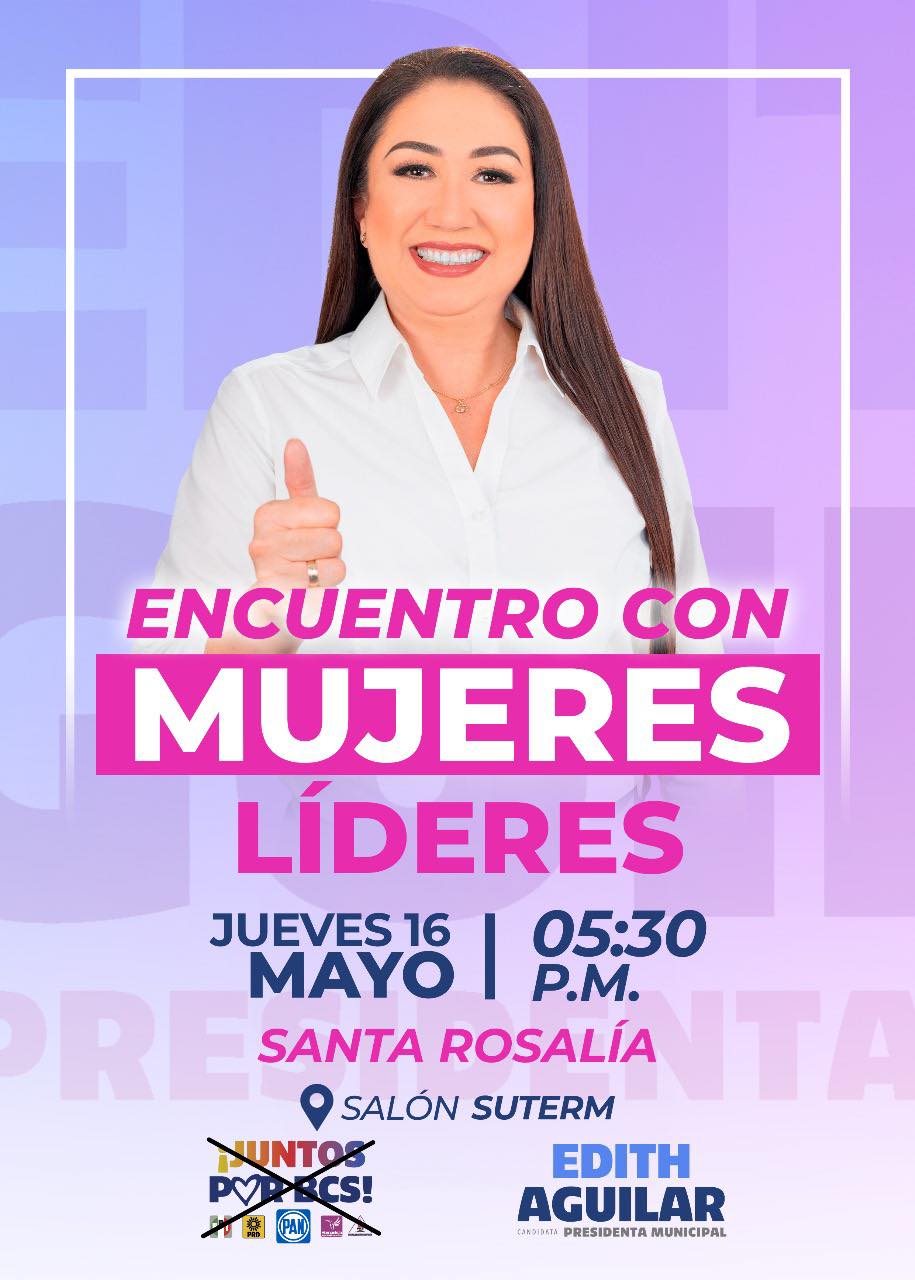 Santa Rosalía, B.C.S.- Edith Aguilar Villavicencio, candidata a la alcaldía de Mulegé por la coalición Juntos x B.C.S convoca a las mujeres líderes del municipio a participar en un encuentro el próximo jueves 16 de mayo a las 17:30 en el Salón SUTERM de la cabecera municipal.