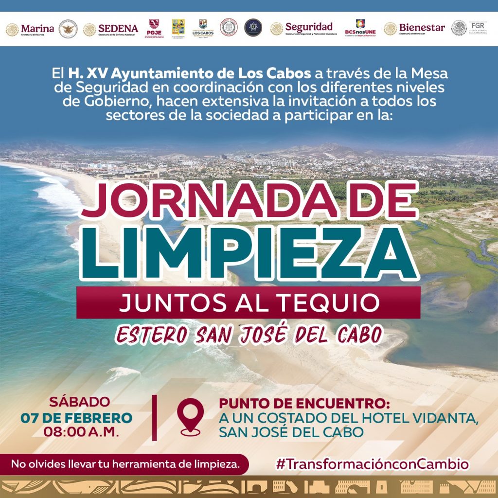 Los Cabos, Baja California Sur | 5 de febrero del 2026.- El XV Ayuntamiento de Los Cabos, a través de la Mesa de Seguridad y en coordinación con los diferentes niveles de Gobierno, hace una extensiva invitación a todos los sectores de la sociedad para participar en la jornada de limpieza denominada «Juntos al Tequio», la cual se realizara en el Estero de San José del Cabo el próximo sábado 07 de febrero a partir de las 08:00 de la mañana.