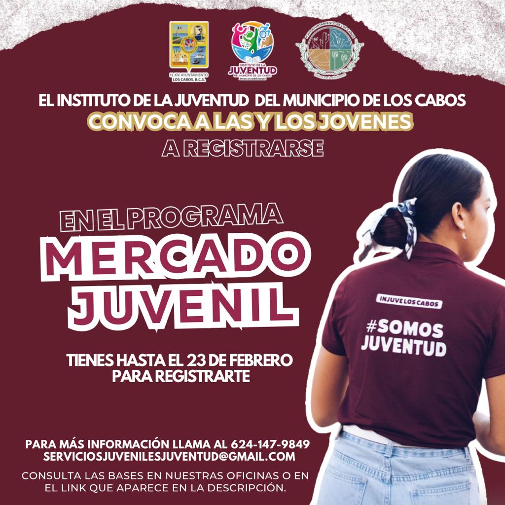 Con el objetivo de insertar a la población joven en el mundo laboral-empresarial de una manera adecuada, el Gobierno de Los Cabos que preside Oscar Leggs Castro a través del Instituto de la Juventud (INJUVE), convoca a todas las y los jóvenes de entre 18 y 29 años de edad que radiquen en el municipio y que cuenten con una empresa en lo denominado “Economía Informal” a registrarse en el Programa Mercado Juvenil.