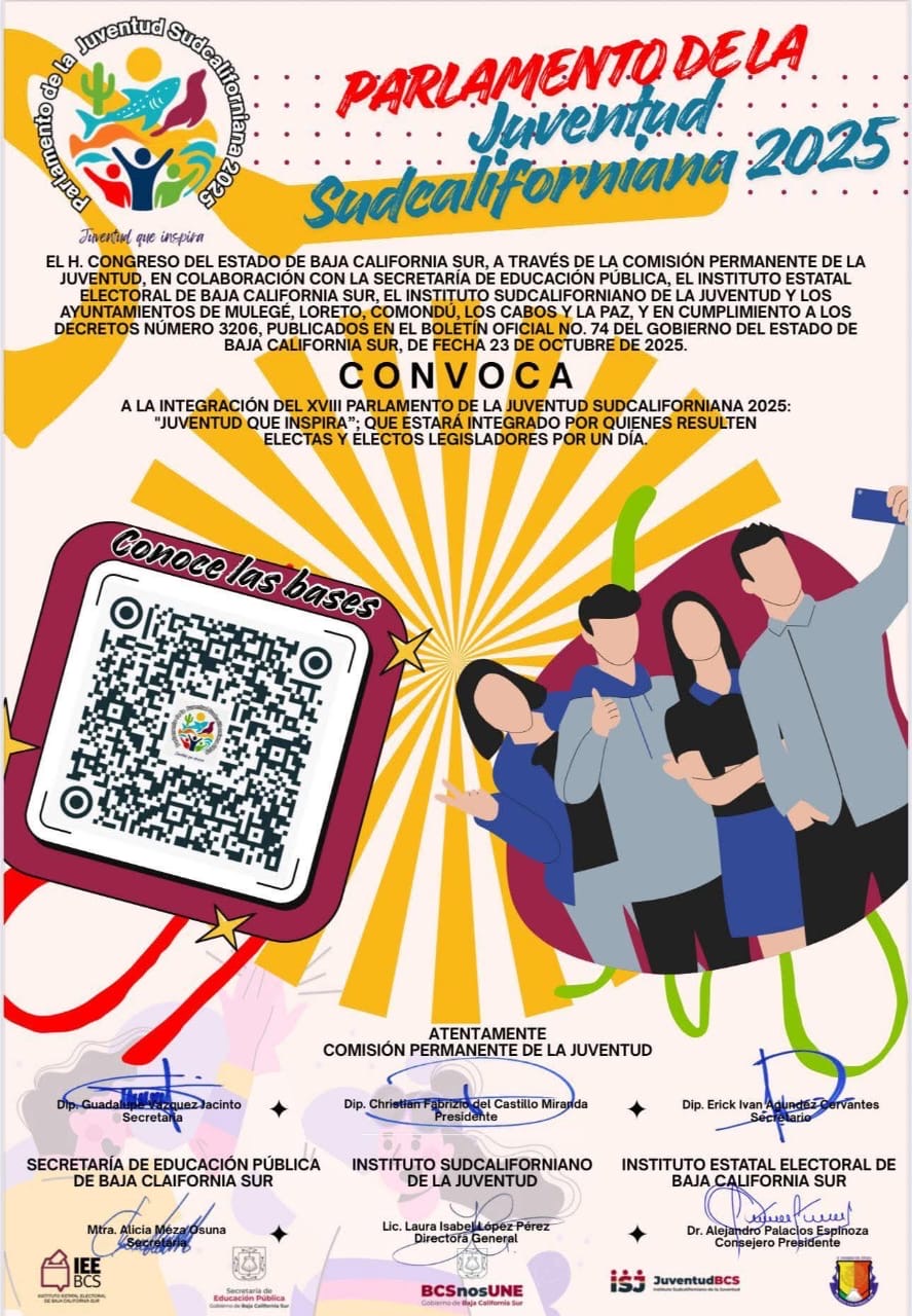 Loreto, B.C.S. 17 de noviembre, 2025.– Para fomentar el interés y la participación de los jóvenes en la vida pública y legislativa de la entidad, el Instituto Municipal de Atención a la Juventud (IMAJ) en colaboración con el H. Congreso del Estado de BCS, convocan a adolescentes loretanos de 13 a 17 años, a participar en el XVIII Parlamento de la Juventud Sudcaliforniana 2025, “Juventud que Inspira”.