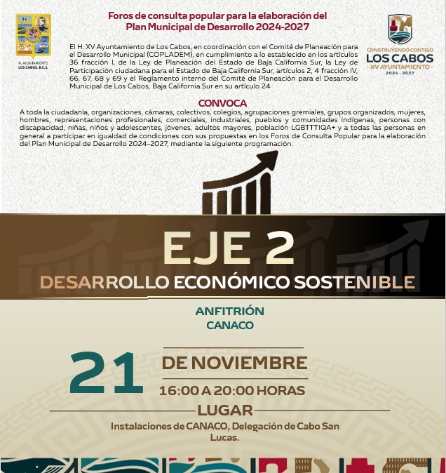 Los Cabos, Baja California Sur.- El XV Ayuntamiento de Los Cabos invita a la población en general a que asista el próximo jueves 21 de noviembre a partir de las 16:00 horas al Foro de Consulta Popular correspondiente al tema de desarrollo económico sostenible, a llevar a cabo en el auditorio de la Cámara Nacional de Comercio (Canaco), en la delegación de Cabo San Lucas. El objetivo principal es que la sociedad participe con sus propuestas y proyectos para la elaboración del Plan Municipal de Desarrollo (PMD) 2024-2027.