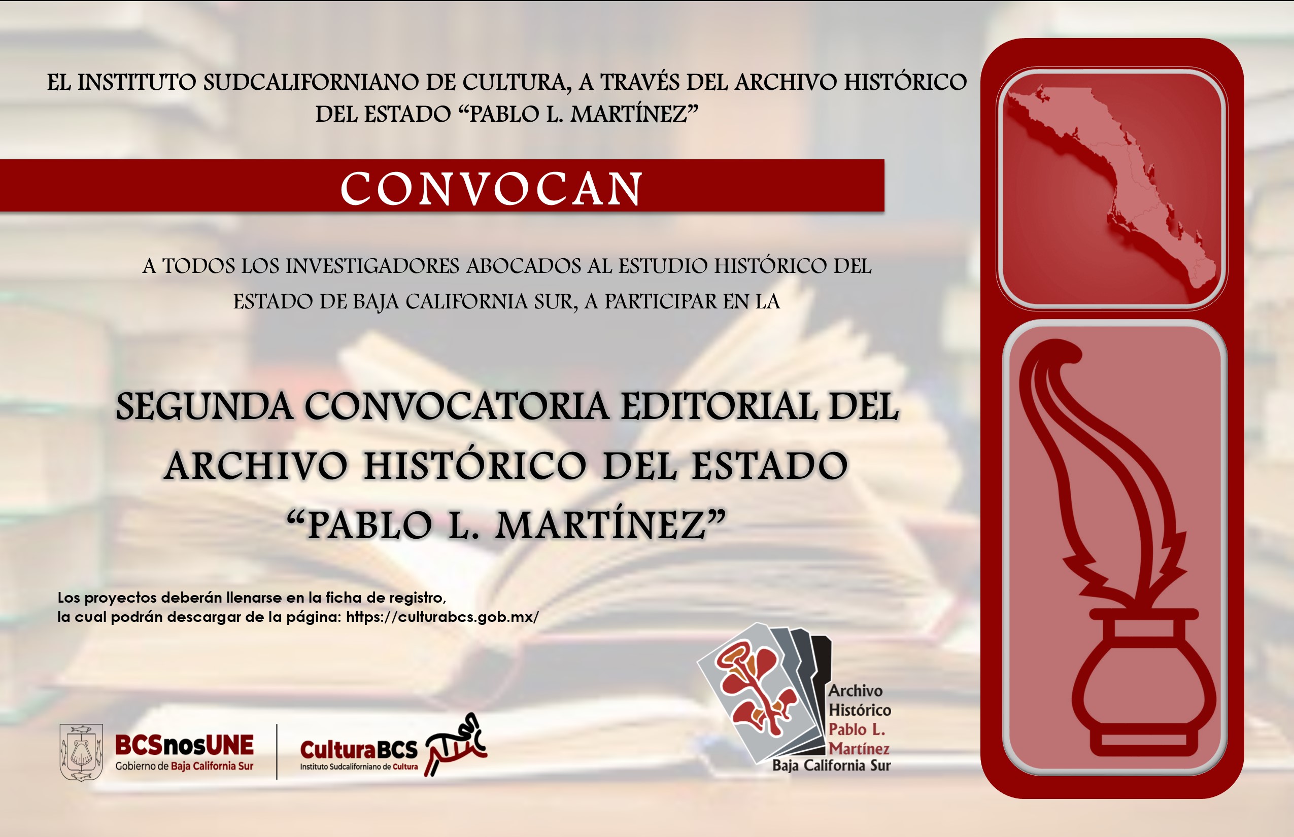 El Instituto Sudcaliforniano de Cultura (ISC), a través del Archivo Histórico del Estado “Pablo L. Martínez” (AHPLM), convoca a todos los investigadores  del estudio histórico del estado de Baja California Sur a que envíen un libro inédito de su autoría como propuesta a publicación (PAP) para someter a dictamen por el consejo editorial del Instituto.