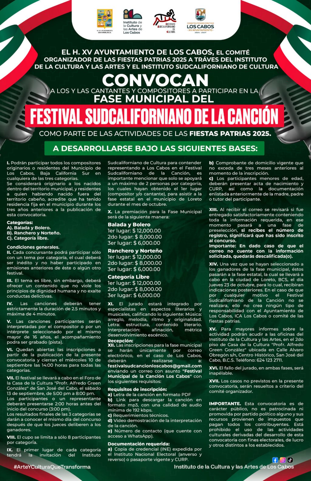 Los Cabos, Baja California Sur | 26 de agosto del 2025.- El XV Ayuntamiento de Los Cabos, a través del Instituto de la Cultura y las Artes (ICA), invita a compositoras y compositores originarios o residentes del municipio a participar en el Festival Sudcaliforniano de la Canción 2025, en su fase municipal.