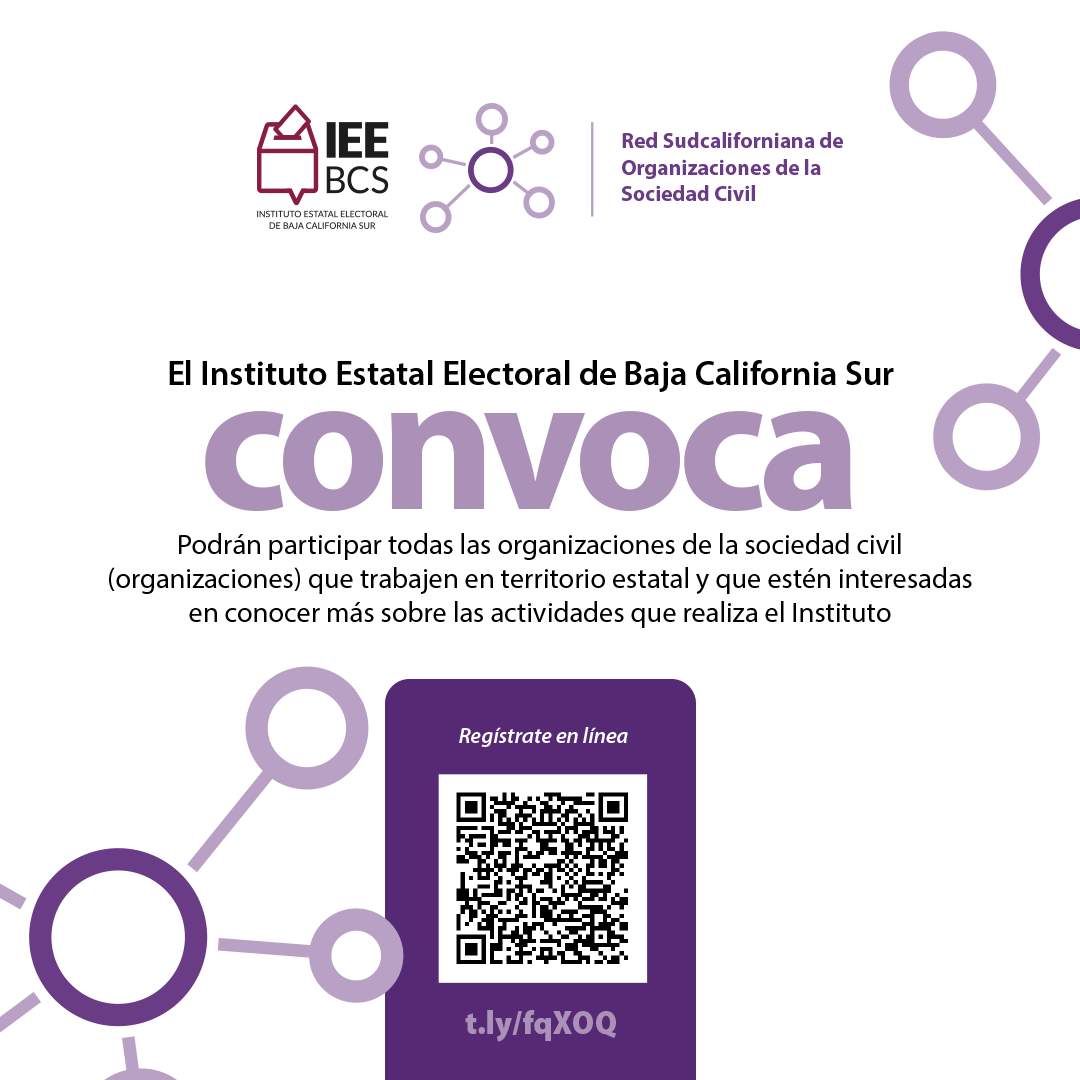El Instituto Estatal Electoral de Baja California Sur, a través de la Comisión de Educación Cívica y Capacitación Electoral, extienden una invitación a todas las Organizaciones de la Sociedad Civil para que se registren y sean parte de la “Red Sudcaliforniana de Organizaciones de la Sociedad Civil en pro de la Participación Ciudadana” con el objetivo de reforzar la cultura democrática en el estado.