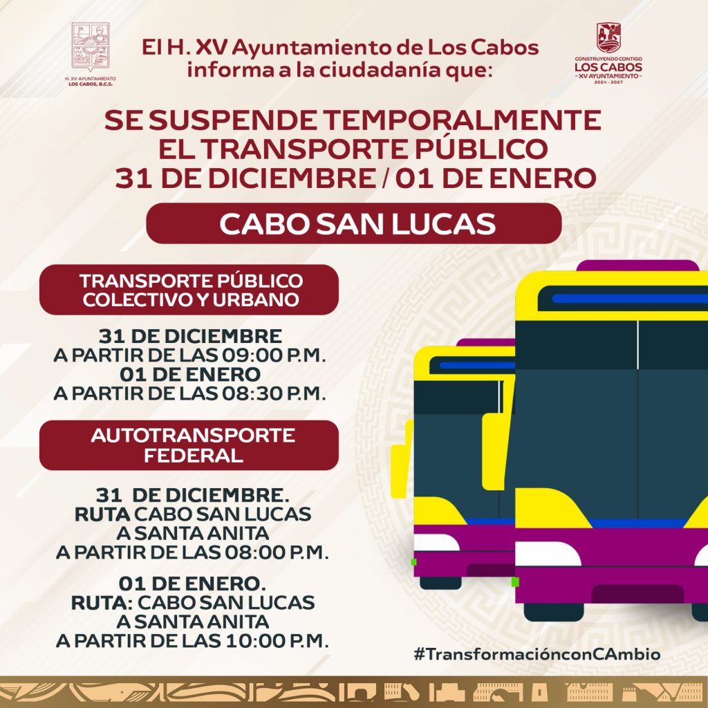Los Cabos, Baja California Sur | 27 de diciembre del 2025.– El XV Ayuntamiento de Los Cabos a través de la Dirección Muncipal de Transporte, informa a la ciudadanía que, con motivo de las celebraciones de Año Nuevo y como medida preventiva para garantizar una movilidad ordenada y segura, se implementarán la suspensión temporal del servicio del transporte público colectivo, urbano y del autotransporte federal, durante el 31 de diciembre y el 01 de enero.
