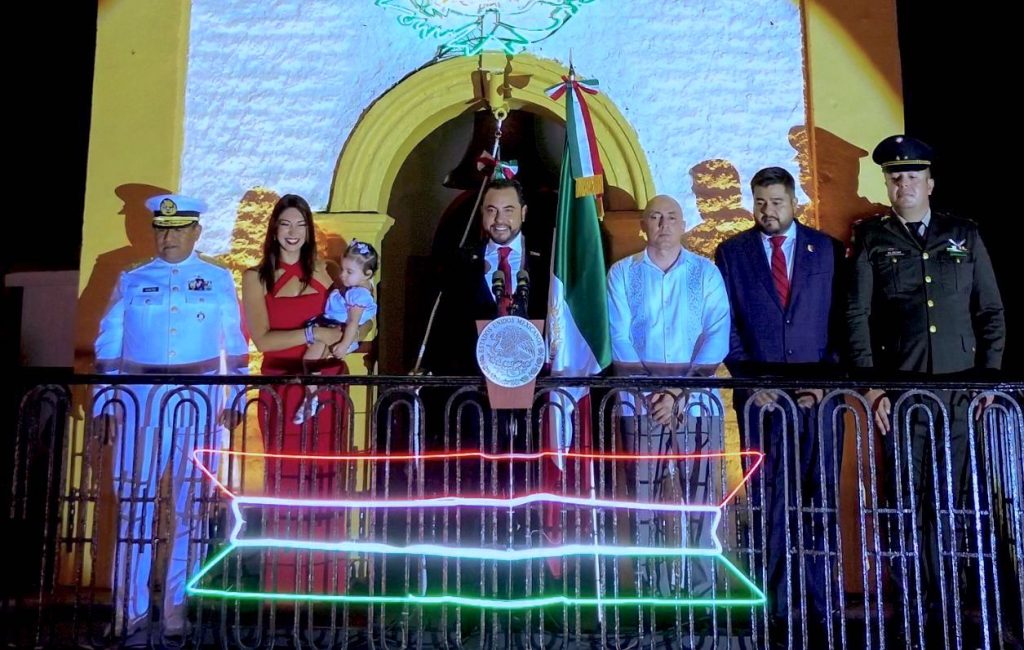 Los Cabos, Baja California Sur | 16 de septiembre del 2025.- Cientos de familias celebraron el 215° Aniversario de la Independencia de México, en una ceremonia solemne encabezada por el alcalde de Los Cabos, Christian Agúndez Gómez, quien desde el balcón del Palacio Municipal en San José del Cabo, en compañía de la presidenta honoraria del Sistema DIF Los Cabos Sol Delgado Moreno, sus hijas y autioridades de los 3 niveles de Gobierno, recordó a los héroes y heroínas que dieron patria a la nación, al grito de «Viva México».
