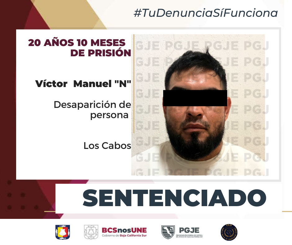 Derivado de investigación penal coordinada por parte del agente del Ministerio Público, agentes estatales de investigación y peritos, la Procuraduría General de Justicia del Estado (PGJE), obtuvo la sentencia condenatoria de 20 años 10 meses de prisión y 2 mil 666 días de multa en contra de Víctor Manuel “N”, mediante procedimiento abreviado, a quien logró acreditar su responsabilidad en la comisión del delito de desaparición cometida por particulares agravada.