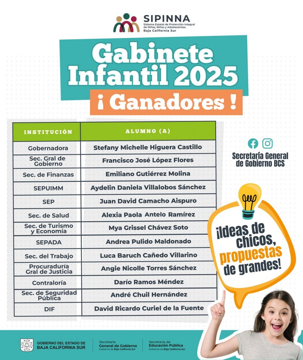 Un total de 104 niñas y niños que cursan quinto y sexto año de primaria de instituciones públicas y privadas del municipio de La Paz, participaron en la convocatoria para integrar el Gabinete Infantil 2025, informó la titular de la Secretaría Ejecutiva del Sistema Estatal de Protección Integral de Niñas, Niños y Adolescentes (SIPINNA), Laura Sofía Villa Urías.