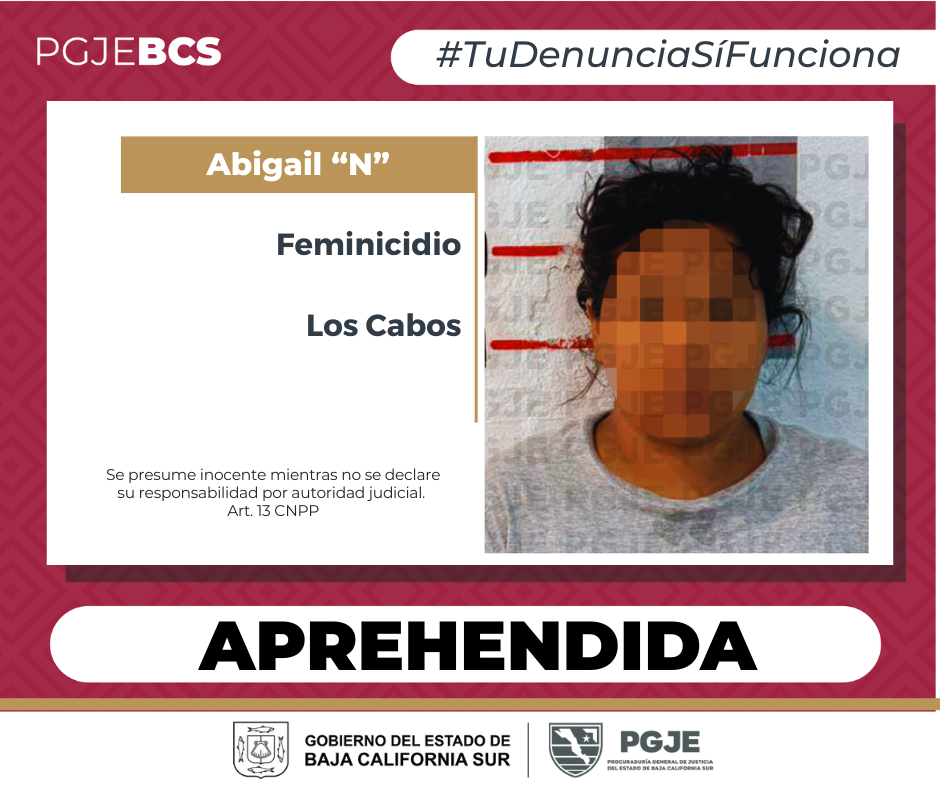 Derivado de las investigaciones realizadas por agentes de investigación adscritos a la Subprocuraduría de Atención a Delitos de Alto Impacto (SADAI), la Procuraduría General de Justicia del Estado (PGJE) de Baja California Sur informa que, se cumplimentó orden de aprehensión en contra de una mujer por su probable responsabilidad en el delito de feminicidio.