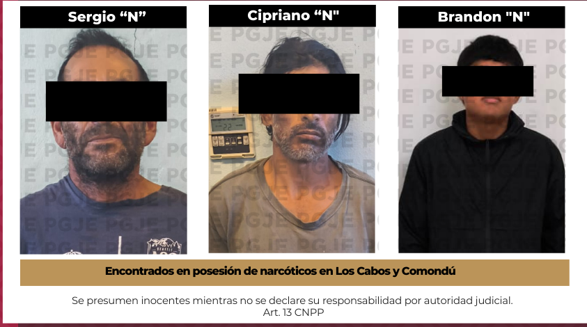 Como resultado de diversos operativos antinarcóticos, agentes de investigación de la Procuraduría General de Justicia del Estado (PGJE) de Baja California Sur, adscritos a la Subprocuraduría de Atención a Delitos de Alto Impacto (SADAI), detuvieron a tres hombres y aseguraron diversas sustancias ilícitas en los municipios de Comondú y Los Cabos.