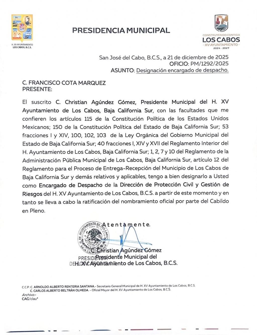 Asimismo, informó que la Secretaría General le notificó su nombramiento como encargado del despacho de la Dirección de Protección Civil y Gestión de Riesgos, con fecha 21 de diciembre de 2025, en tanto se realiza la ratificación correspondiente en la próxima sesión de Cabildo.