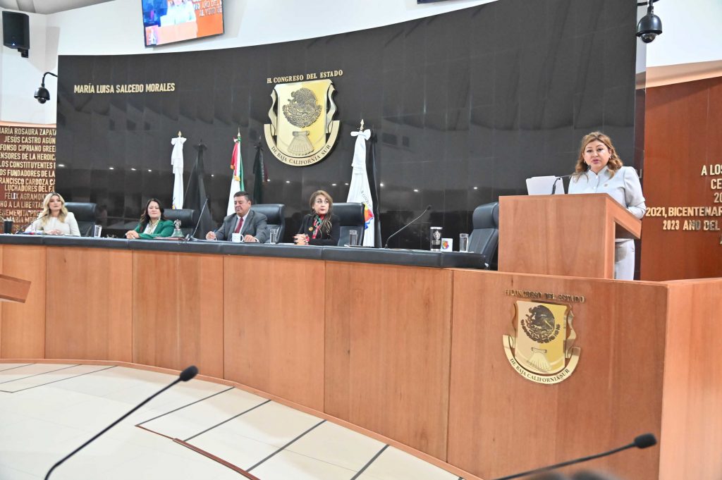 Cristina Contreras preside la Mesa Directiva acompañada de la diputada Karina Olivas (PT) como secretaria y los diputados Sergio Polanco (MORENA) como vicepresidente y Sergio Guluarte Ceseña (MORENA) como prosecretario.
