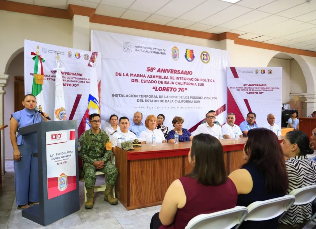 Loreto, B.C.S. 13 de octubre, 2025.– Al encabezar la ceremonia conmemorativa por el 55 Aniversario de la Integración Política de Baja California Sur “Loreto 70”, la alcaldesa Paz del Alma Ochoa Amador aseveró que Loreto es y ha sido un referente fundamental en el desarrollo de la vida política del estado y un ejemplo probado históricamente de cómo la voluntad y la determinación ciudadana, son cruciales para lograr la transformación de los pueblos.