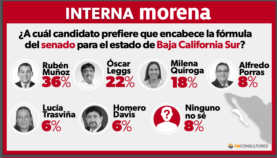 En el muestreo de la empresa Encuesta de FM Consultores ponen en las preferencias rumbo al Senado de la República por Baja California Sur a Rubén Muñoz, Oscar Leggs y aMilena Quiroga con un 36%, 22% y un 18% según el muestreo realzado a finales del mes de septiembre, en el segmento de aspirantes de MORENA a este cargo en los próximos comisiones del 2024.