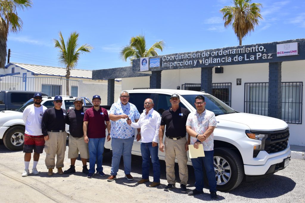 Como parte del compromiso de mejorar la atención en las comunidades pesqueras del municipio de La Paz, el director del Fondo para la Protección de los Recursos Marinos (FONMAR), Martín Inzunza Tamayo, realizó la entrega de una unidad vehicular tipo pick-up a la Coordinación de Ordenamiento, Inspección y Vigilancia de La Paz de dicha dependencia.