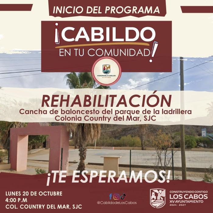 Los Cabos, Baja California Sur | 18 de octubre del 2025.- Este lunes 20 de octubre a las 16:00 horas, el XV Ayuntamiento de Los Cabos pondrá en marcha el programa “Cabildo en tu comunidad”, con la rehabilitación de la cancha de baloncesto del parque de la ladrillera, ubicada en la colonia Country del Mar, en San José del Cabo.