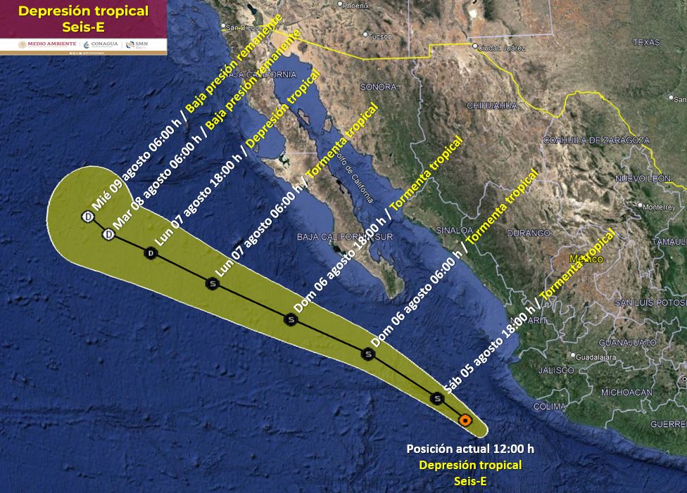 En el reporte de las 12:15 horas de ste sábado, del Servicio Metereológico Nacional (SNM) de la Comisión Nacional del Agua (CONAGUA) la depresión Seis-E se localiza frente a las costas de Colima y Jalisco, misma que genra lluvias fuertes a puntuales intensas, vientos fuertes y oleaje elevado en el occidente del país.