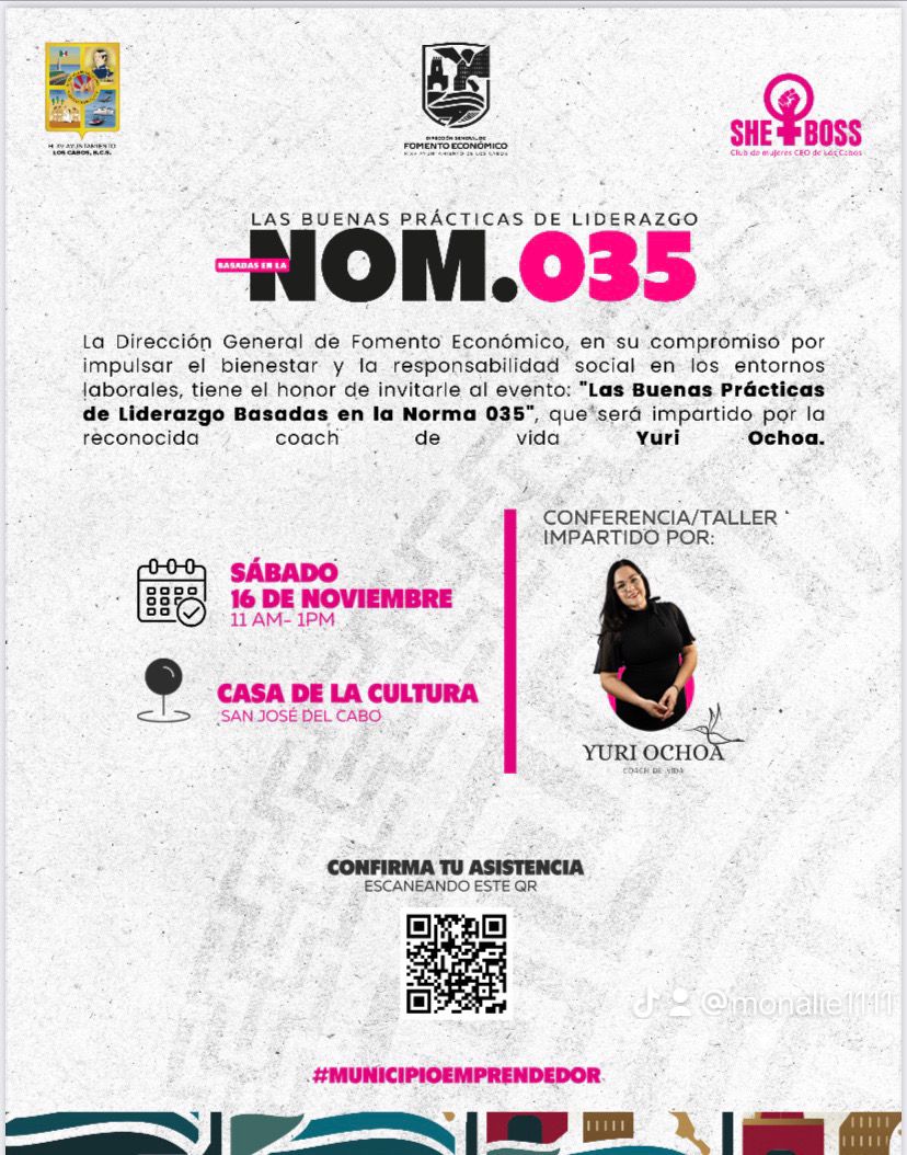 En ese sentido, la directora general de Fomento Económico del XV Ayuntamiento de Los Cabos, Abril Aurífera Martínez informó que el evento será impartido por la coach de vida Yuri Ochoa y se basará en la implementación de la Norma Oficial Mexicana 35 (NOM-035-STPS-2018), que promueve el desarrollo de ambientes laborales saludables y responsables.