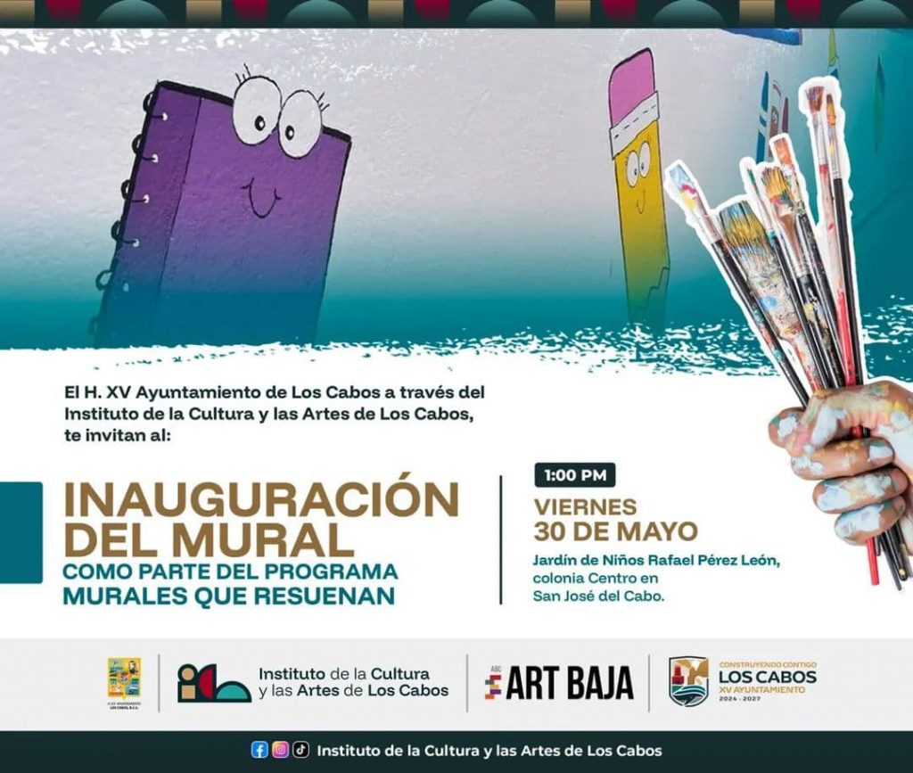 Los Cabos, Baja California Sur | 30 de mayo del 2025 Como parte del programa permanente “Murales que Resuenan”, el Instituto de la Cultura y las Artes de Los Cabos (ICA), en colaboración con Art Baja realizará este viernes 30 de mayo la inauguración de un mural en San José del Cabo.