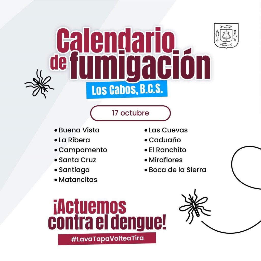 Los Cabos, Baja California Sur.- El XV Ayuntamiento de Los Cabos, que encabeza Christian Agúndez Gómez, en coordinación con la Secretaría de Salud del Gobierno del Estado, informa que este viernes 17 de octubre se llevará a cabo una jornada de fumigación contra el mosquito transmisor del dengue en la zona norte del municipio.