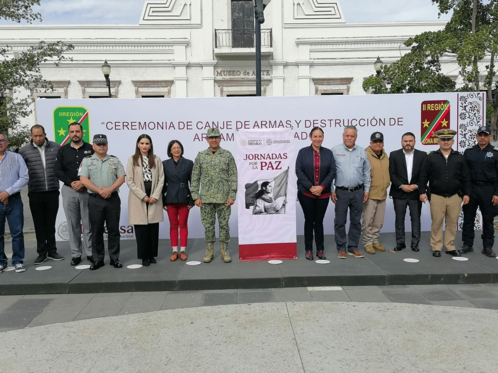Con la representación del gobernador Víctor Manuel Castro Cosío, el subsecretario de Protección Civil en la entidad, Héctor Amparano Herrera, asistió a la ceremonia de canje de armas y destrucción de armamento entregado por la población, acto que estuvo encabezado por el comandante de la Tercera Zona Militar, Tomás Amador Ramírez y autoridades de los tres órdenes de gobierno.
