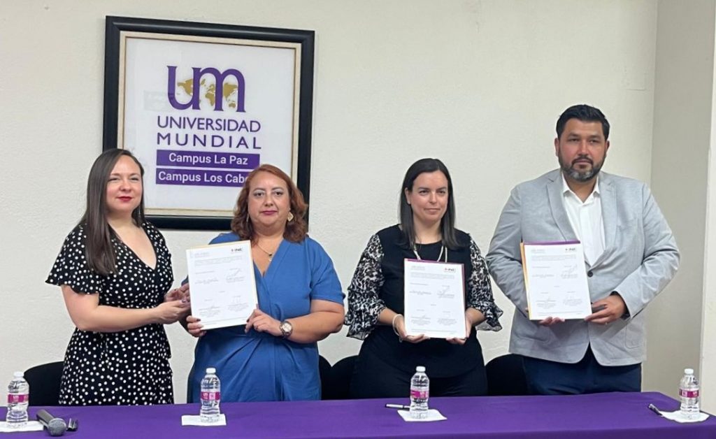 En un acto significativo para el fortalecimiento de la formación ciudadana y la vinculación interinstitucional, la Universidad Mundial y el Instituto Nacional Electoral (INE) formalizaron este martes un convenio de colaboración en el Salón Dr. Alfonso García Robles, del campus La Paz.