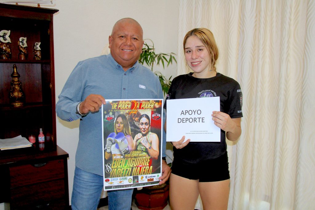 Los Cabos, Baja California Sur | 2 de septiembre del 2025.- En representación de la delegada de Cabo San Lucas Karina de la O Uribe, el coordinador de la Secretaría General, Víctor Castro Martínez recibió a la boxeadora profesional Edén Inairam Villavicencio Aguirre, conocida como “La Muñeca”, a quien entregó un apoyo económico para su preparación física de cara a su próxima pelea que se llevará a cabo el sábado 06 de septiembre.