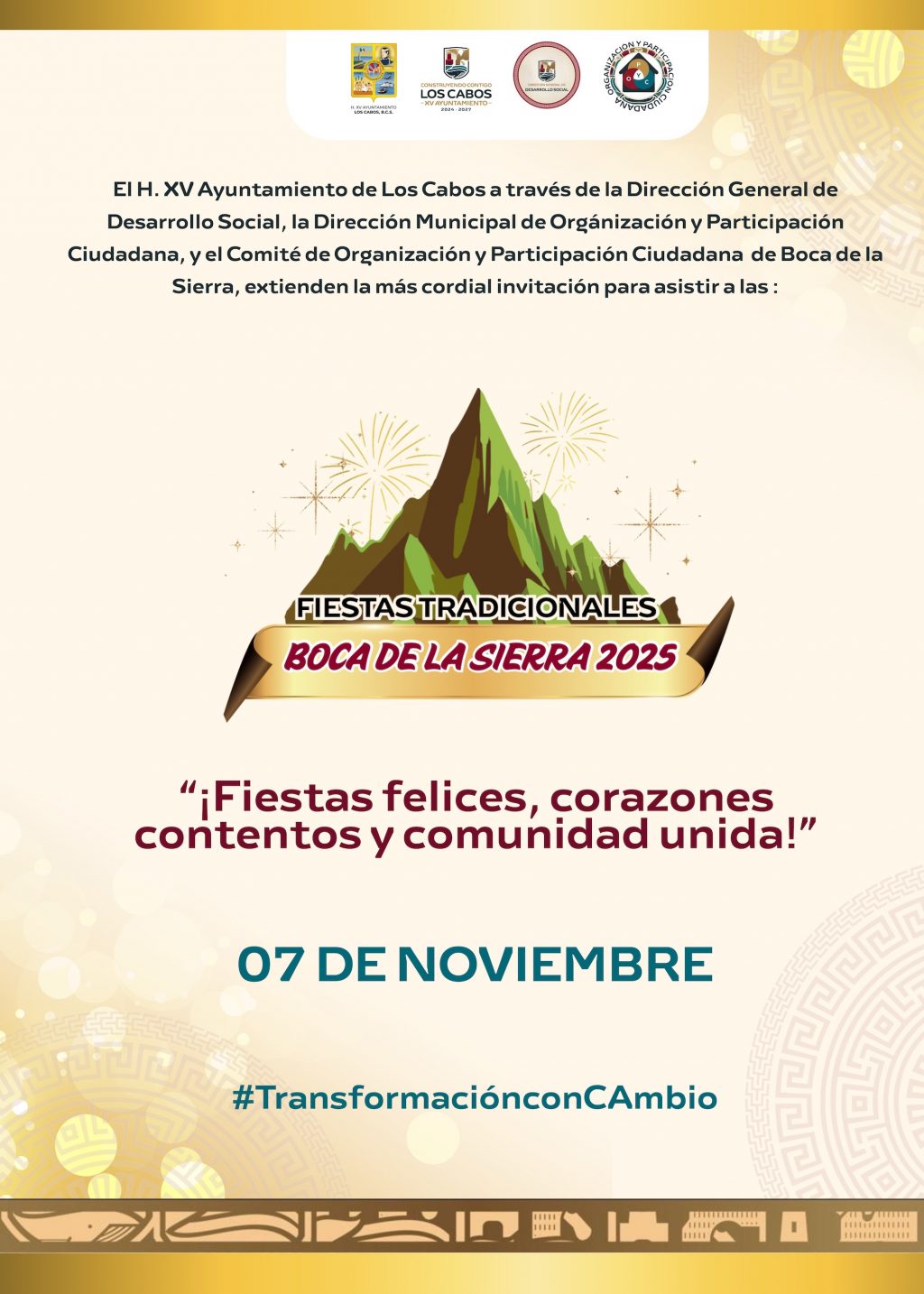 Los Cabos, Baja California Sur | 3 de noviembre del 2025.- El XV Ayuntamiento de Los Cabos, a través de la Dirección General de Desarrollo Social y la Dirección Municipal de Organización y Participación Ciudadana, impulsa el fortalecimiento de las raíces culturales del municipio con la celebración de las Fiestas Tradicionales Boca de la Sierra 2025 y San Dionisio 2025, dos eventos que promueven la identidad, la convivencia y el orgullo comunitario.