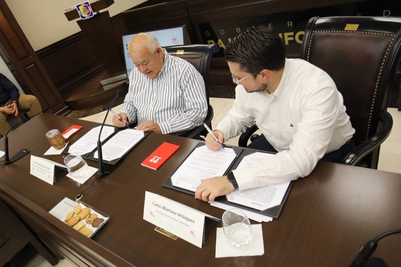 El gobernador Víctor Manuel Castro Cosío y el director general del Instituto Nacional del Fondo de la Vivienda para los Trabajadores (Infonavit), Carlos Martínez Velázquez, firmaron convenio de colaboración a fin de simplificar trámites relacionados a la autoproducción de vivienda e inscripción de escrituras y así garantizar el acceso de las familias sudcalifornianas a un patrimonio, otorgando certeza jurídica respecto a su propiedad.
